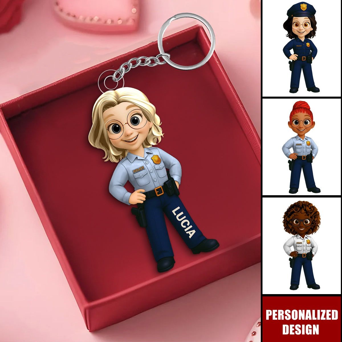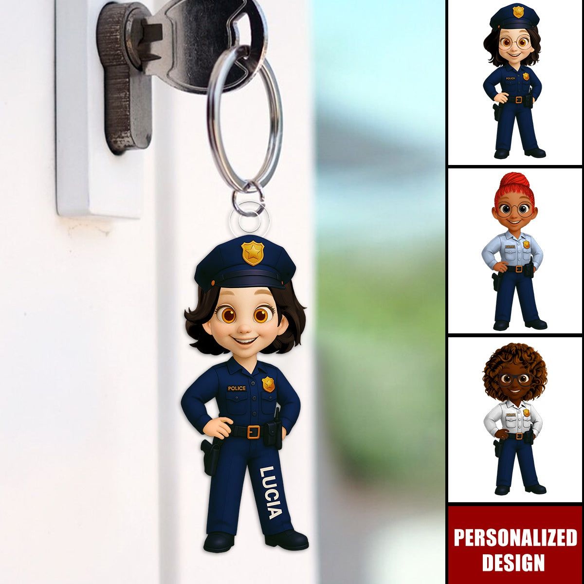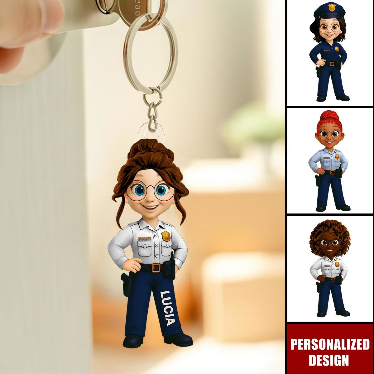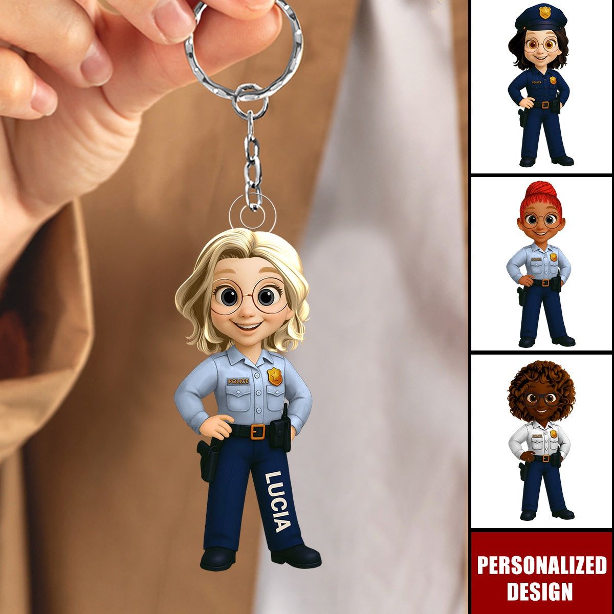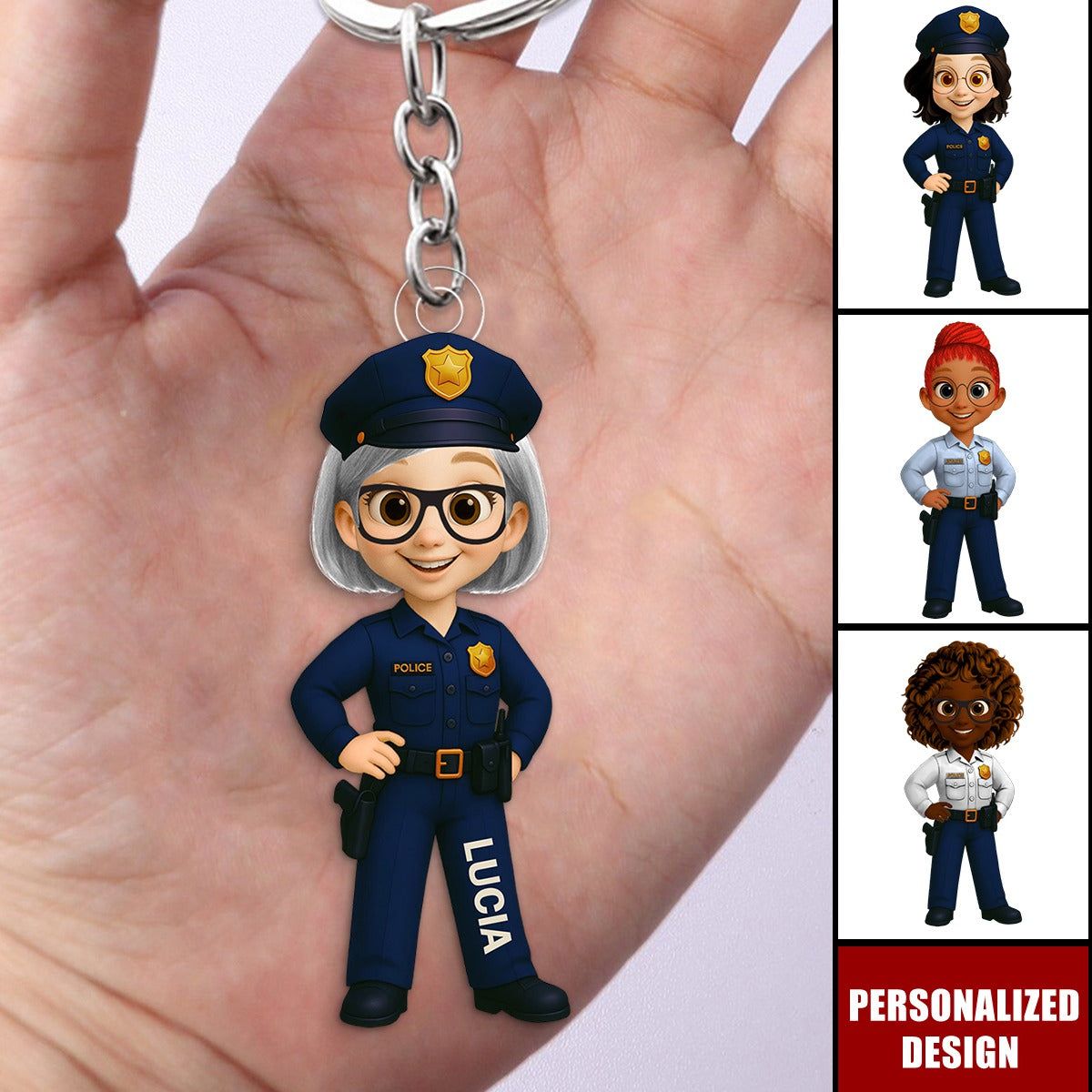 Personalized Woman Police Officer Cartoon Character Keychain-Gift For Law Enforcement
