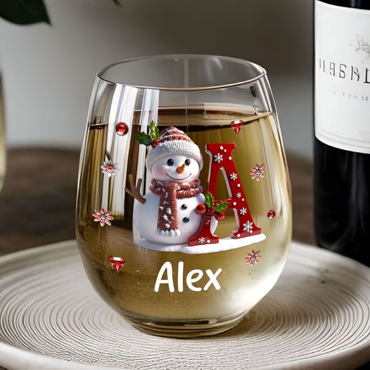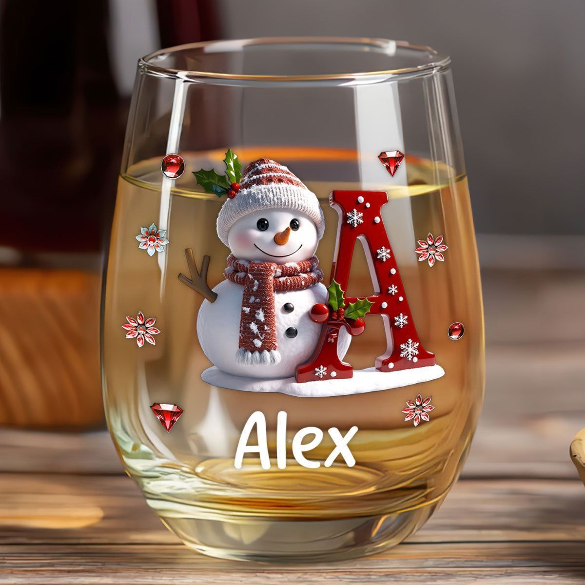 Merry Christmas with a snowman design – a personalized wine glass for family and friends.