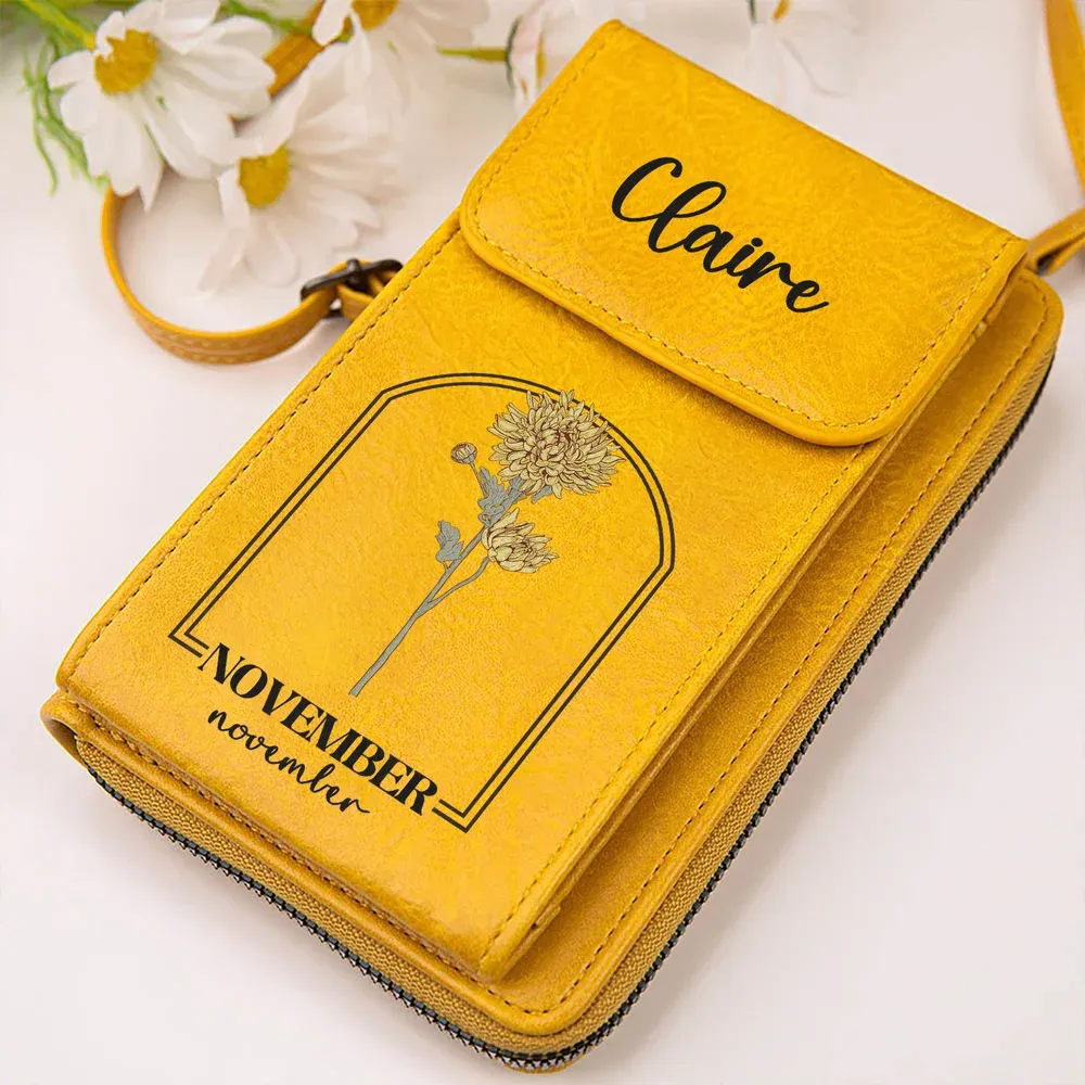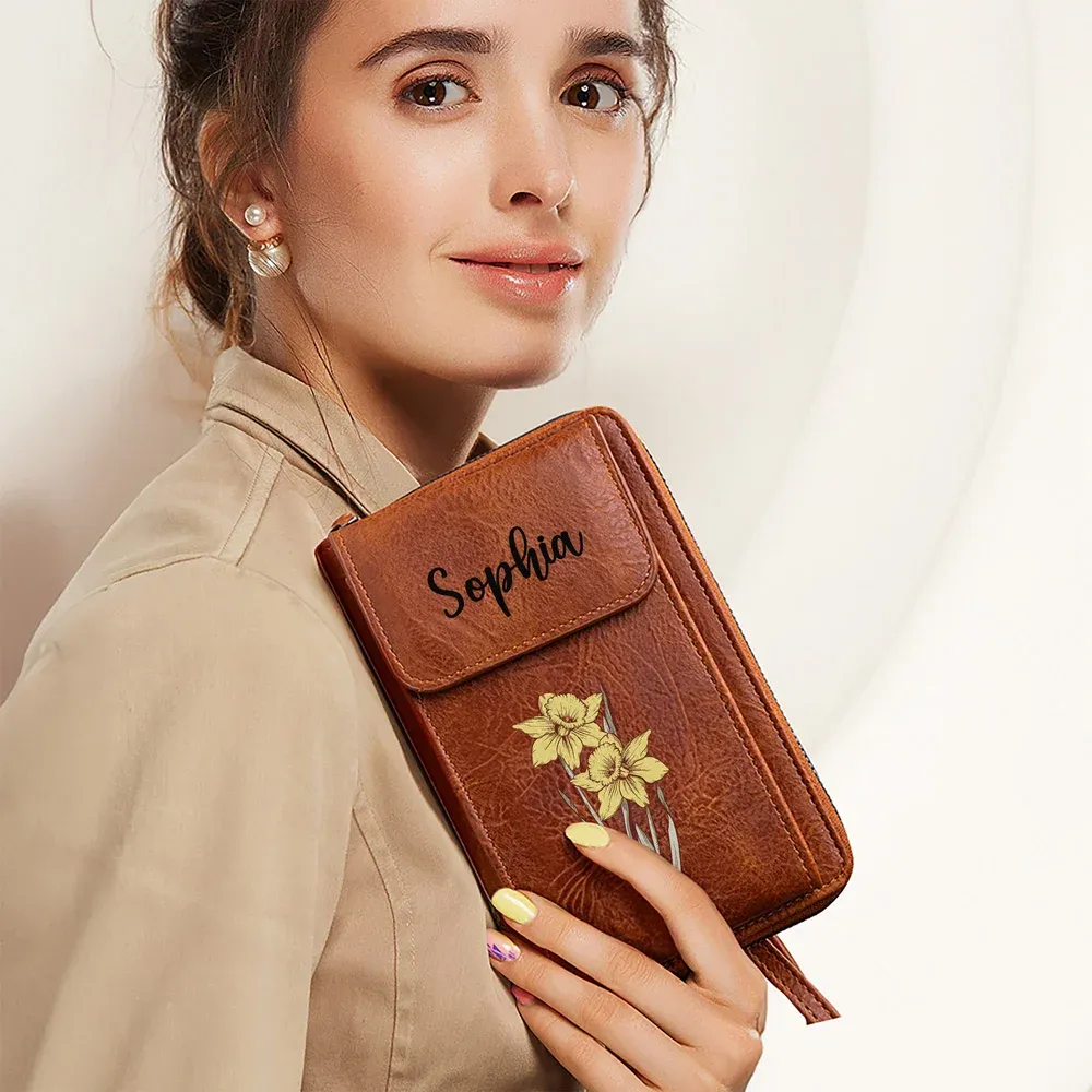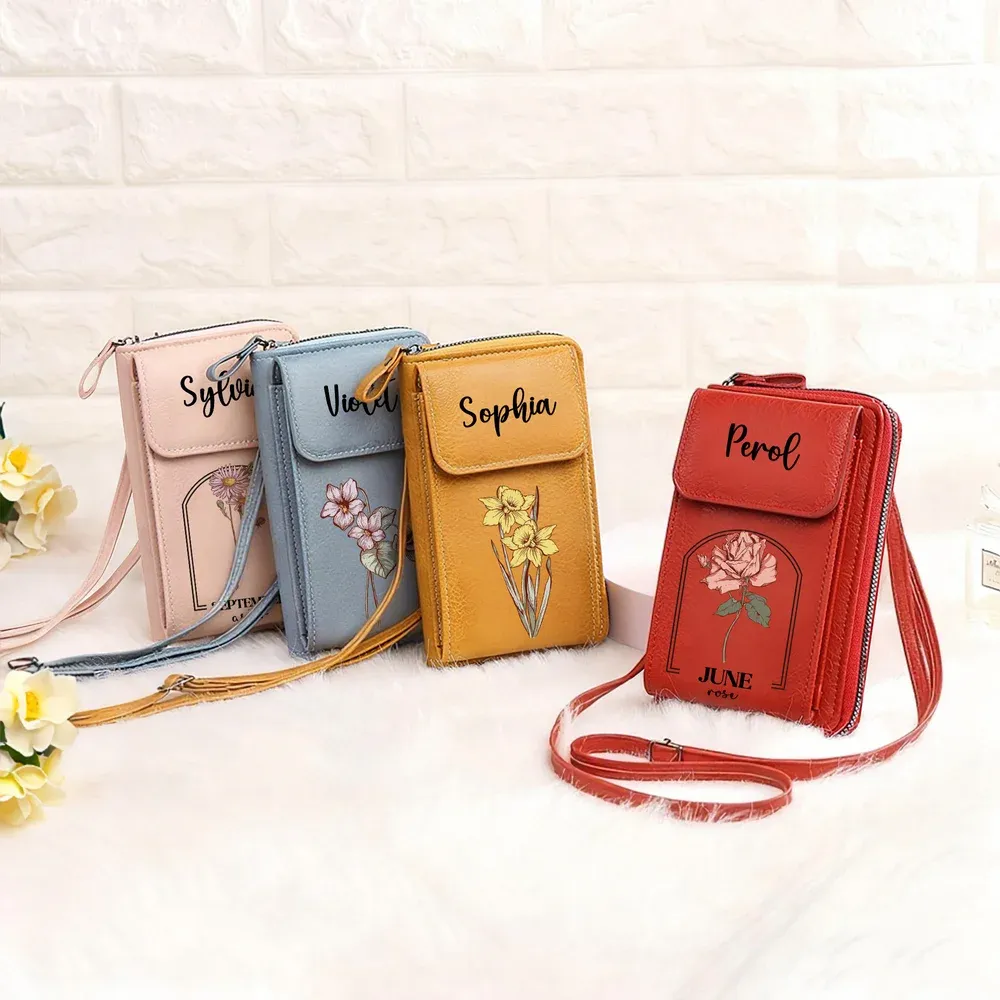 Personalized Birth Flower PU Leather Crossbody Bag Wallet with Name and Card Slots Travel Accessories Birthday Christmas Gift for Women